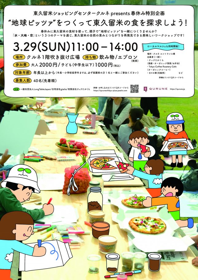 親子で“地球ピッツァ”をつくりながら、東久留米の食材や自然の恵みを「水・大地・空」の3つのテーマで楽しく探求するワークショップです。春休みの思い出づくりにぜひご参加ください。