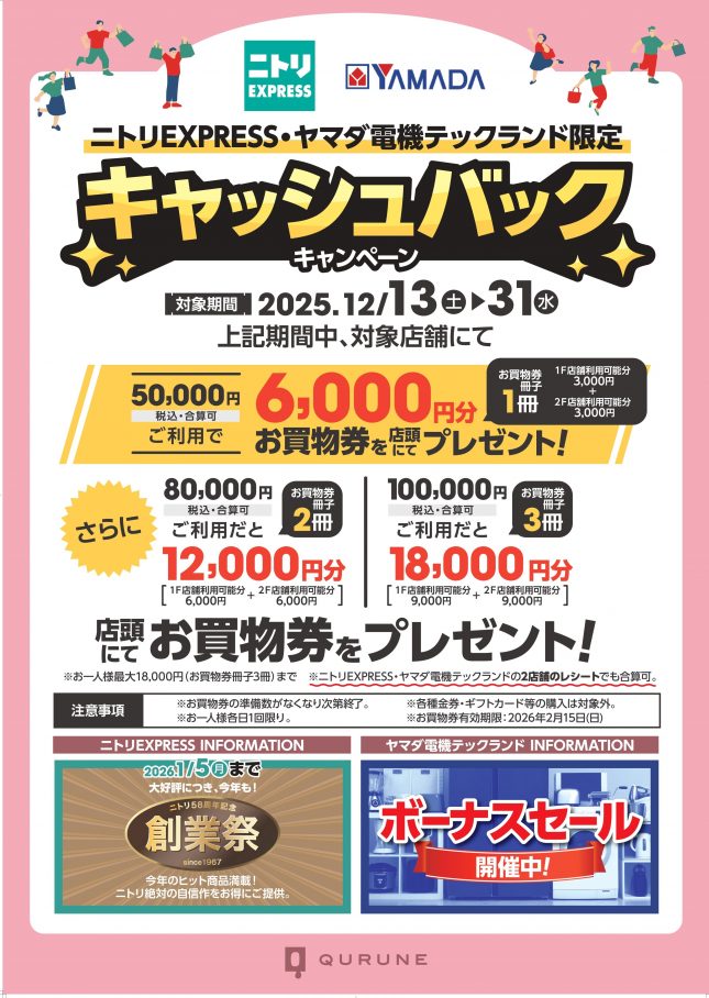 対象期間中、ニトリEXPRESS・ヤマダ電機テックランドにて50,000円(税込・合算可)ご利用で、6,000円分(1F店舗利用可能分3,000円+2F店舗利用可能分3,000円分)のお買物券を店頭にてプレゼントいたします。