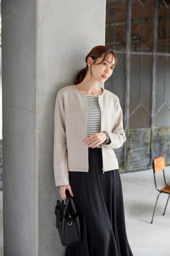 大人のきれいめアウター スエードブルゾン 4,980円(税込) 高級感のある素材に、すっきりとしたノーカラーとジップ使いが上品なデザイン。 さらっと羽織りやすく季節の変わり目に大活躍なアウターです。 新しいアウターと一緒に秋のおでかけをお楽しみください!