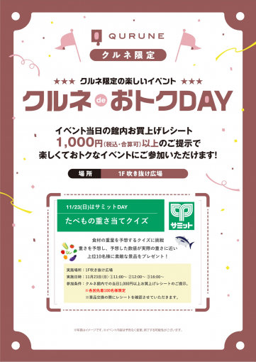 11月から新たにスタート!! クルネでのお買物がもっと楽しくなるクルネ限定のイベントを開催いたします。 今回の「クルネでおトクDAY」の内容はこちら! 【サミット主催】 たべもの重さ当てクイズ 食材の重量を予想するクイズに挑戦! 重さを予想し、予想した数値が実際の重さに近い上位10名様に素敵な景品をプレゼント🎁 【実施日時】 11月23日(日) ①11:00~ ②12:00~ ③16:00~ ※…