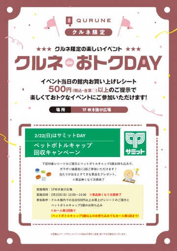 11月から新たにスタート!! クルネでのお買物がもっと楽しくなるクルネ限定のイベントを開催いたします。 今回の「クルネdeおトクDAY」の内容はこちら! 【サミット主催】 ペットボトルキャップ回収キャンペーン クルネ館内での当日500円以上お買上げレシートのご提示とペットボトルキャップ5個以上のお持ち込みでガラポン抽選会に1回ご参加いただけます! 当たりが出た方には景品をプレゼント🎁 ※お一人様1…