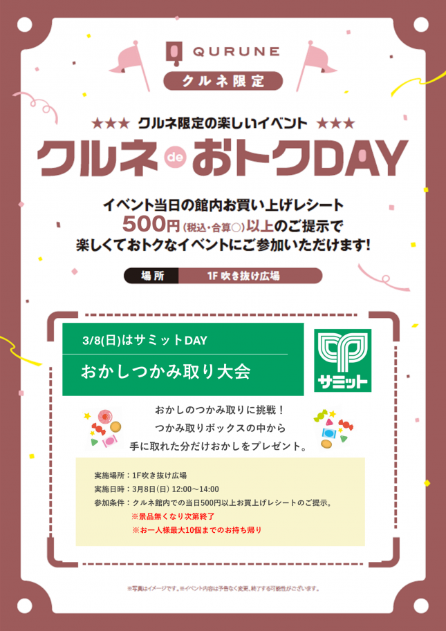 クルネ館内での当日500円以上お買上げレシートのご提示でチョコレートつかみ取り大会ご参加いただけます!
